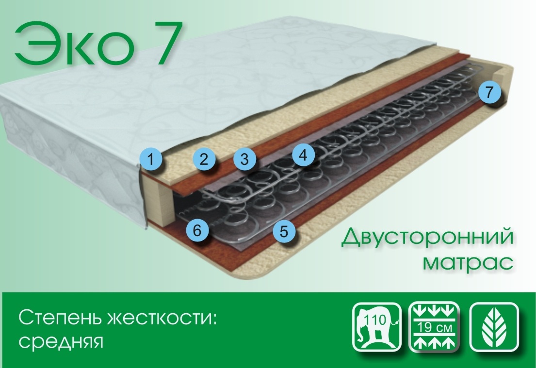 Эко 7 - средняя степень жесткости. Прочный, долговечный, обеспечивает поддержку позвоночника, гипоаллергенный.